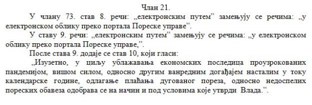 “Izuzetno, u cilju ublažavanja ekonomskih posledica prouzrokovanih pandemijom, višom silom, odnosno drugim vanrednim događajem nastalim u toku kalendarske godine, odlaganje plaćanja dugovanog poreza, odnosno nedospelih poreskih obaveza odobrava se na način i pod uslovima koje utvrdi Vlada”.
